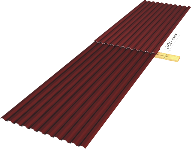 В отличие от металлочерепицы, профнастил монтируется как с правого, так и с левого края от фронтона. Боковой нахлёст обычно выполняют в размере половины волны профиля. У пологих крыш (с уклоном не менее 14°) -с перехлёстом в 2 волны. Между собой листы стягиваются саморезами в верх волны с шагом 200-300 мм или заклёпками с шагом 200 мм. Верх крайней волны профнастила более узкий, чем все остальные волны листа, и именно этот край должен находиться под волной соседнего листа при перехлёсте.